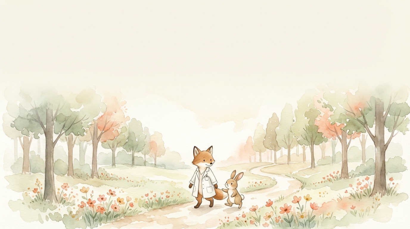 コンコン先生とうさぎさんが小道を歩いている水彩イラスト
